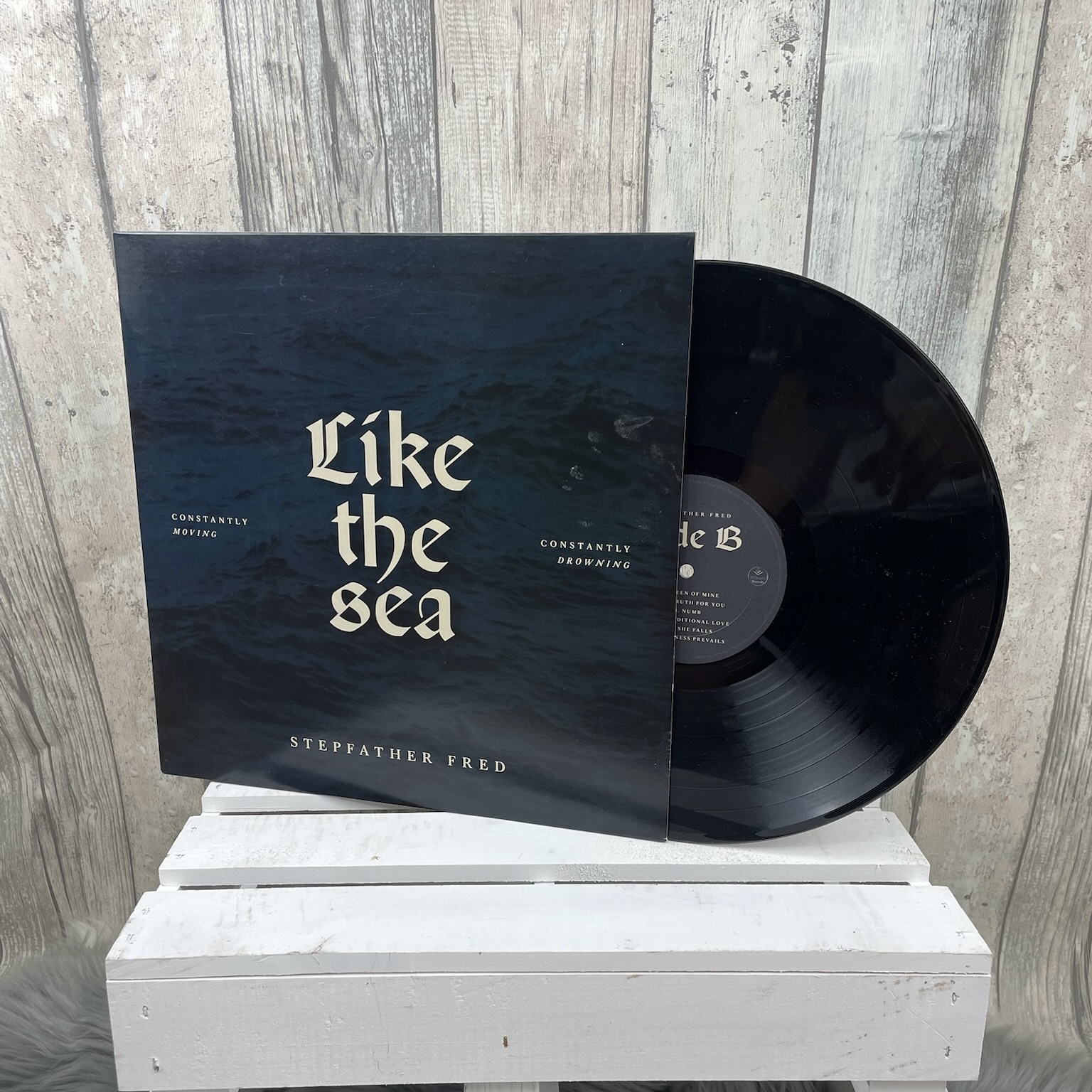 Unser Album Like the Sea – constantly moving, constantly drowning auf schwarzem Vinyl inkl. extra großem Cover Poster.